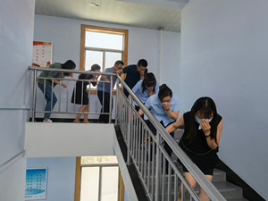 理論培訓后進行火災疏散演練,參加培訓人員在楊教官的指引下,用濕毛巾捂住口鼻,彎腰貼墻迅速有序通過安全出口,奔向辦公樓前空地集合。